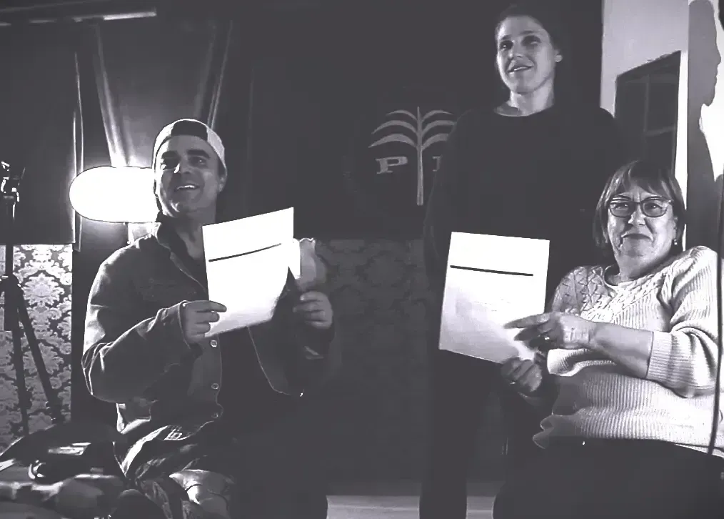 Giovann E. Morassutti con gli attori della compagnia Arlecchino Morassutti durante le riprese del docufilm Memorabilia - Una Storia di Famiglia