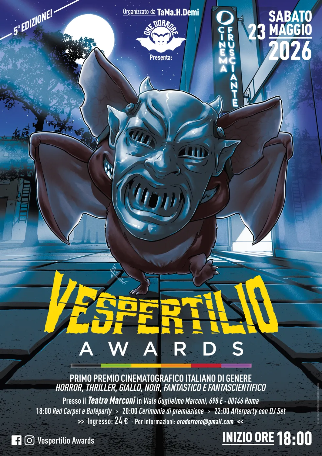 L’appuntamento è fissato per sabato 23 maggio al Teatro Marconi di Roma, dove la quinta edizione del Vespertilio Awards non sarà soltanto una serata di premiazioni, ma anche un’occasione per rendere omaggio ad alcune figure storiche del cinema italiano. Un momento celebrativo, quindi, ma anche di memoria e riconoscenza. E non è un dettaglio da poco il fatto che questa edizione sia dedicata alla figura del critico e amico Federico Frusciante: una dedica che dà un tono preciso all’intera manifestazione e che lega ancora di più il premio a un’idea di cinema vissuto con passione, confronto e partecipazione.